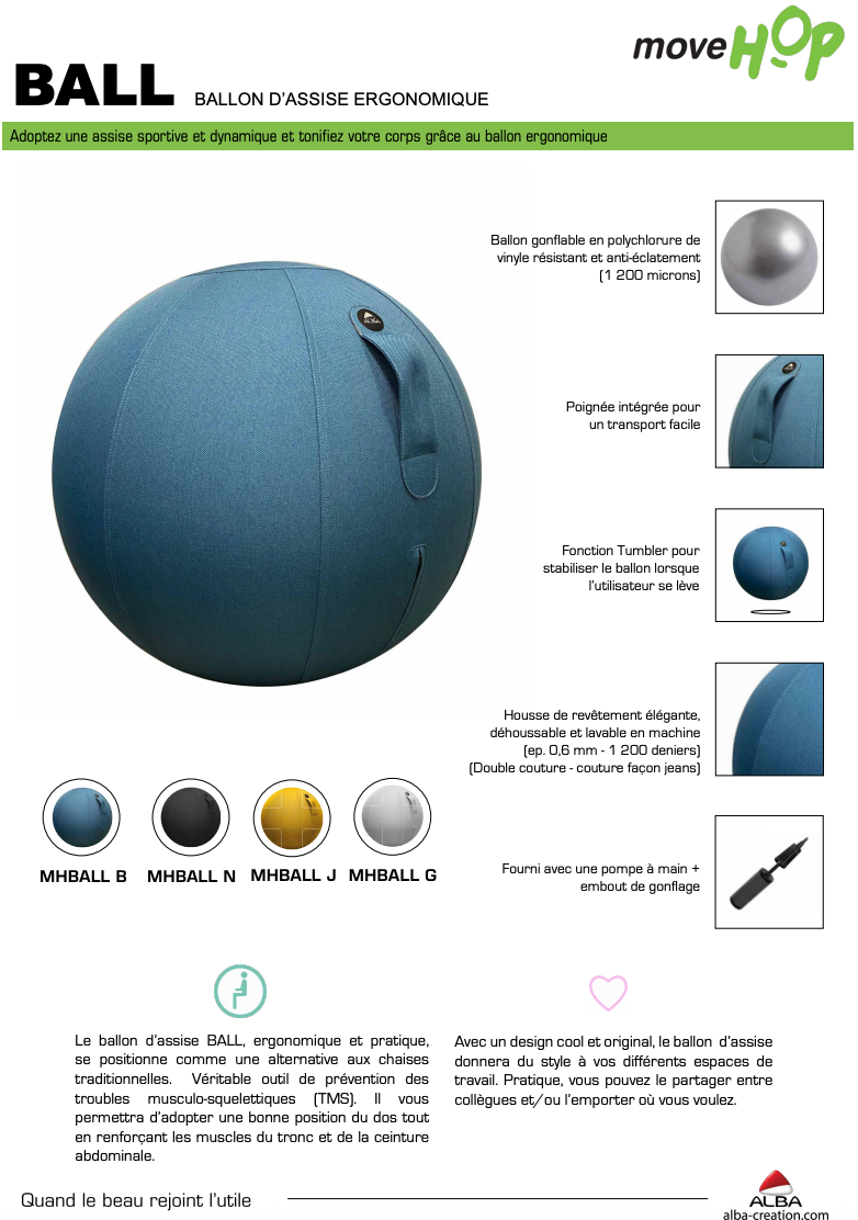 - Dans une démarche de « mieux s’asseoir », le ballon ERGOBALL est une alternative aux chaises traditionnelles pour une posture de travail ergonomique et optimale (prévention des T.M.S).