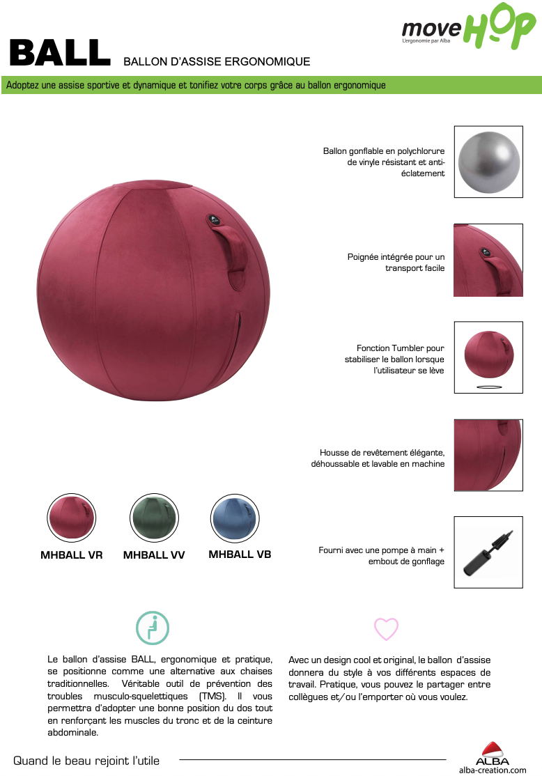 • Dans une démarche de « mieux s’asseoir », le ballon ERGOBALL est une alternative aux chaises traditionnelles pour une posture de travail ergonomique et optimale (prévention des T.M.S).