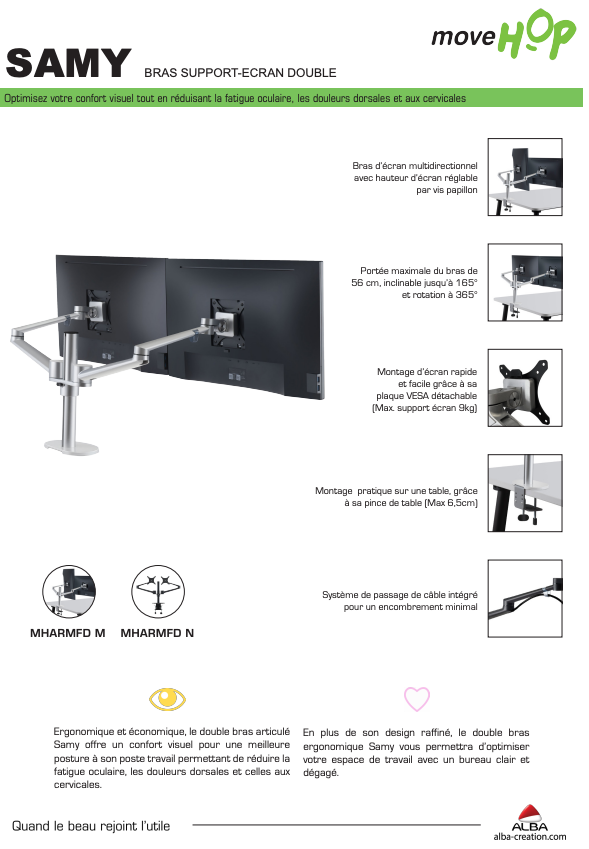 - Le bras double fixe Samy pivote de gauche à droite et permet une rotation de 360° pour dégager l’espace de travail