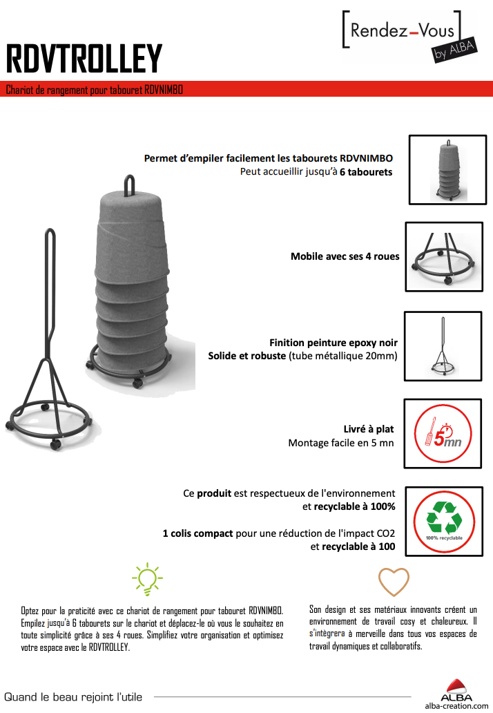 Simplifiez le rangement et le transport de vos tabourets RDVNIMBO grâce à ce chariot ingénieux et robuste. Capable d'empiler jusqu'à 6 tabourets, il garantit un stockage optimisé tout en offrant une mobilité fluide grâce à ses 4 roues solides et maniables.