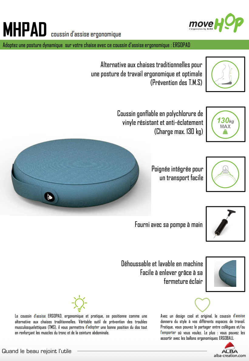 - Permet d'avoir une alternative aux chaises traditionnelles pour une posture de travail ergonomique et optimale (Prévention des T.M.S)