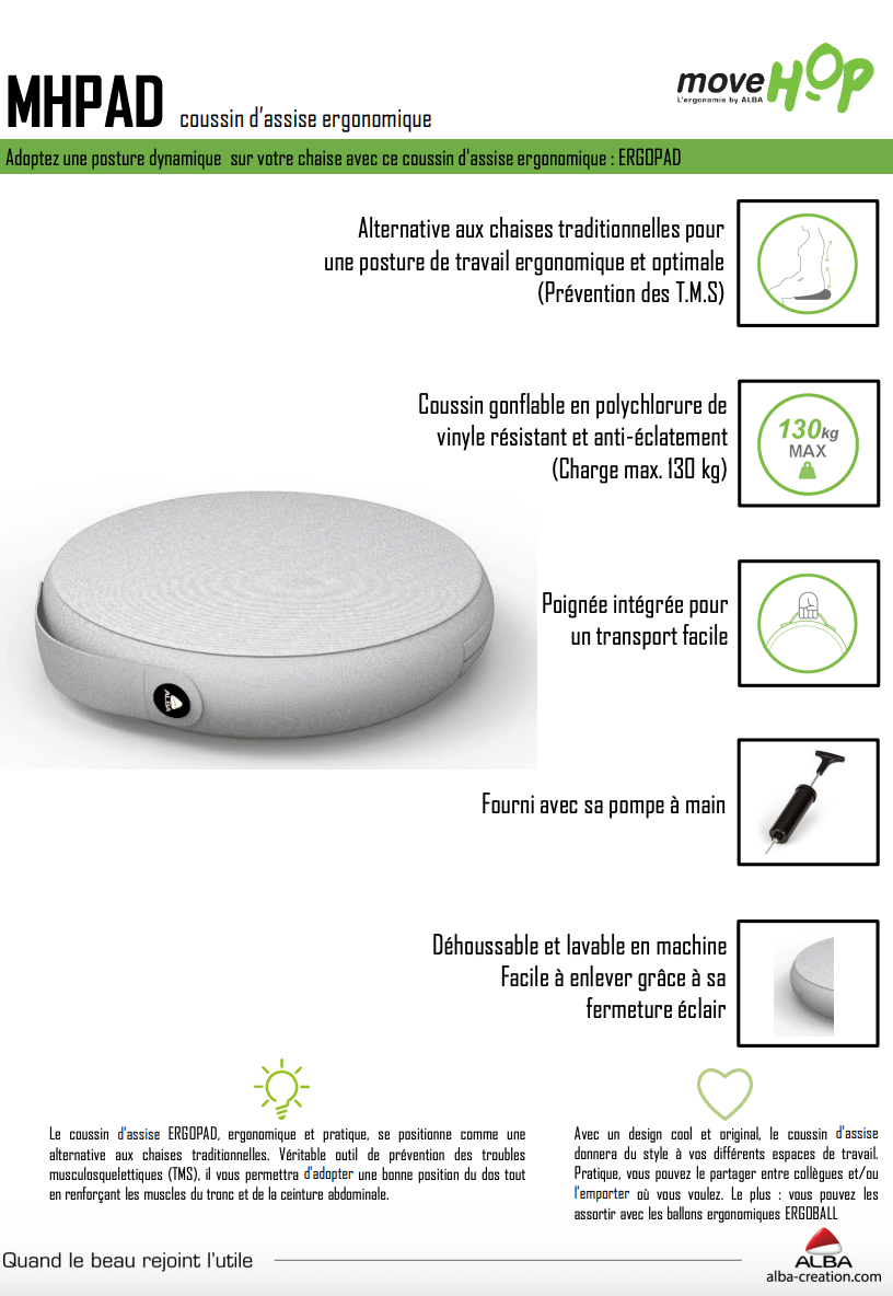 • Permet d'avoir une alternative aux chaises traditionnelles pour une posture de travail ergonomique et optimale (Prévention des T.M.S)