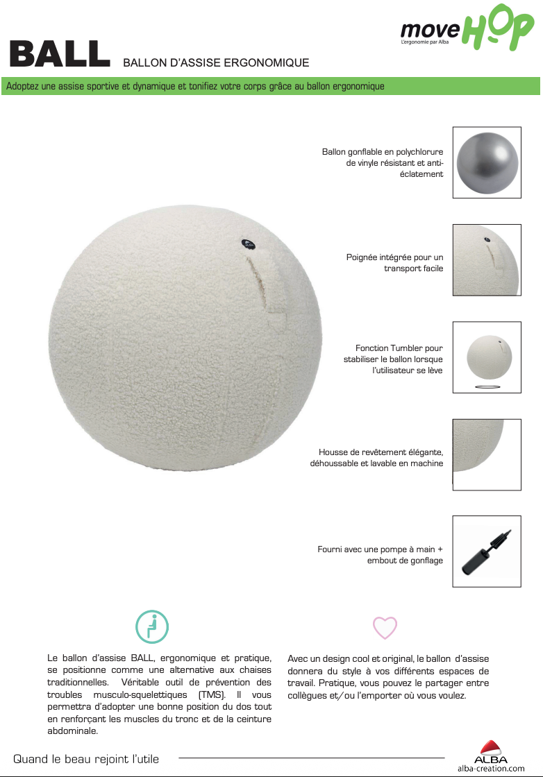 - Dans une démarche de « mieux s’asseoir », le ballon ERGOBALL est une alternative aux chaises traditionnelles pour une posture de travail ergonomique et optimale (prévention des T.M.S).
