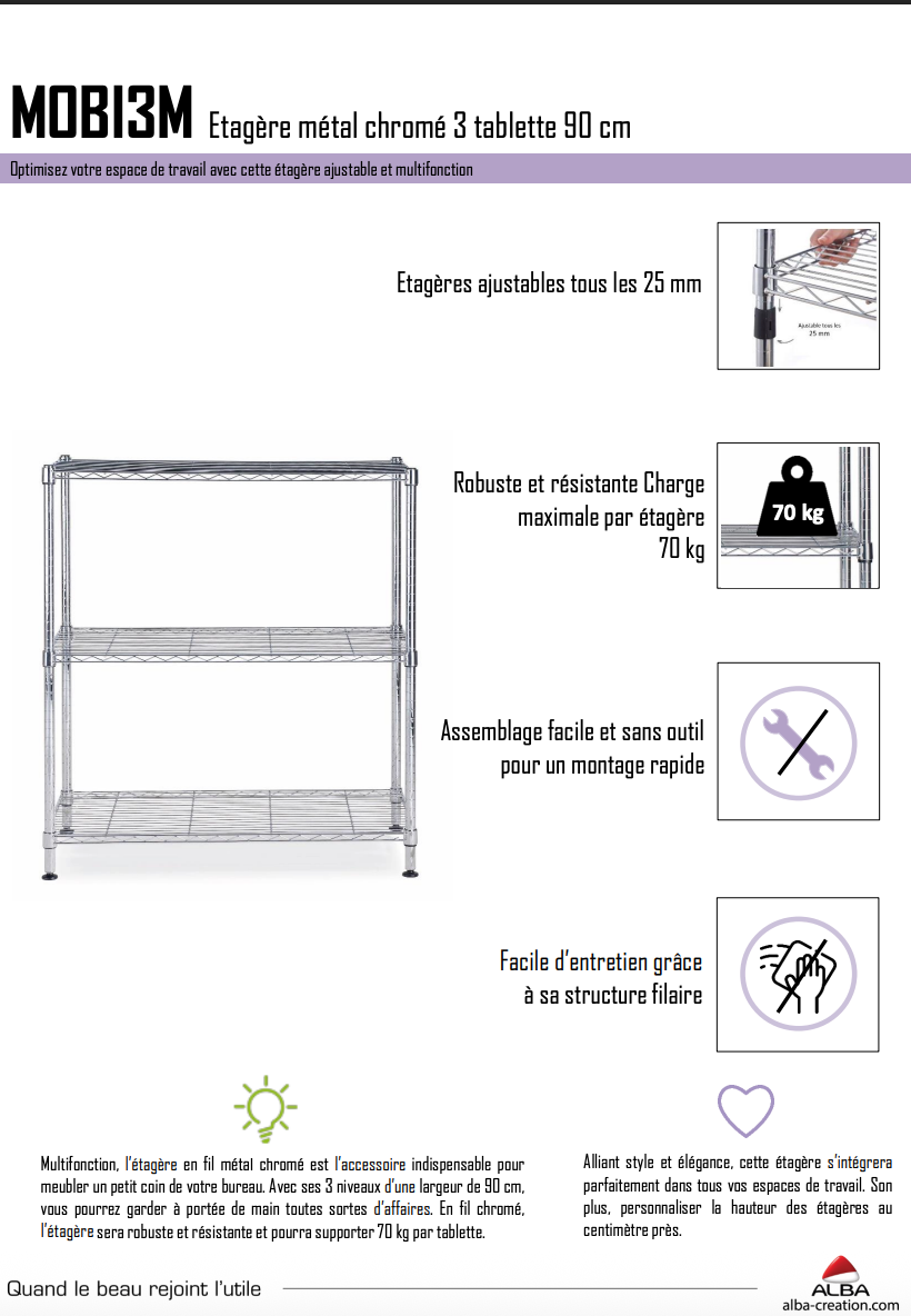 En fil chromé, l’étagère sera robuste et résistante et pourra supporter 70 kg par tablette.