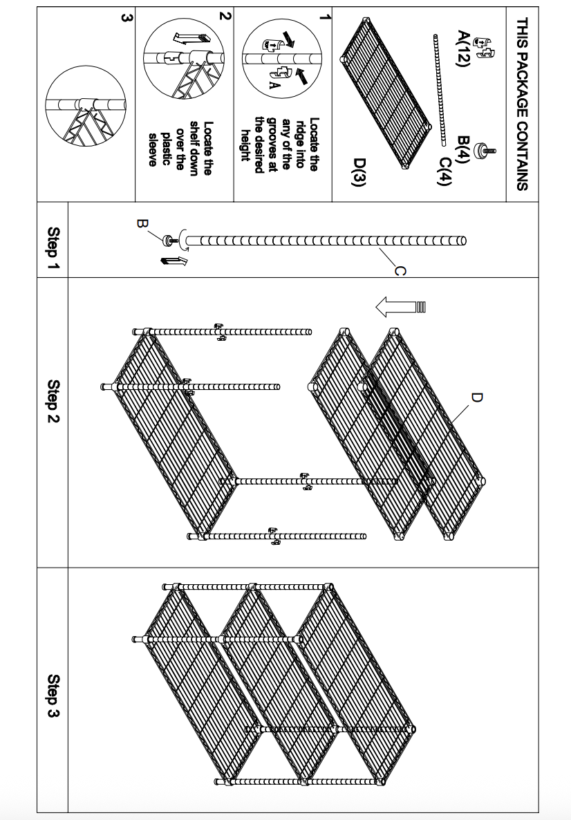 ⦁ L’étagère est composée de 3 tablettes fil de 90 cm (taille M).