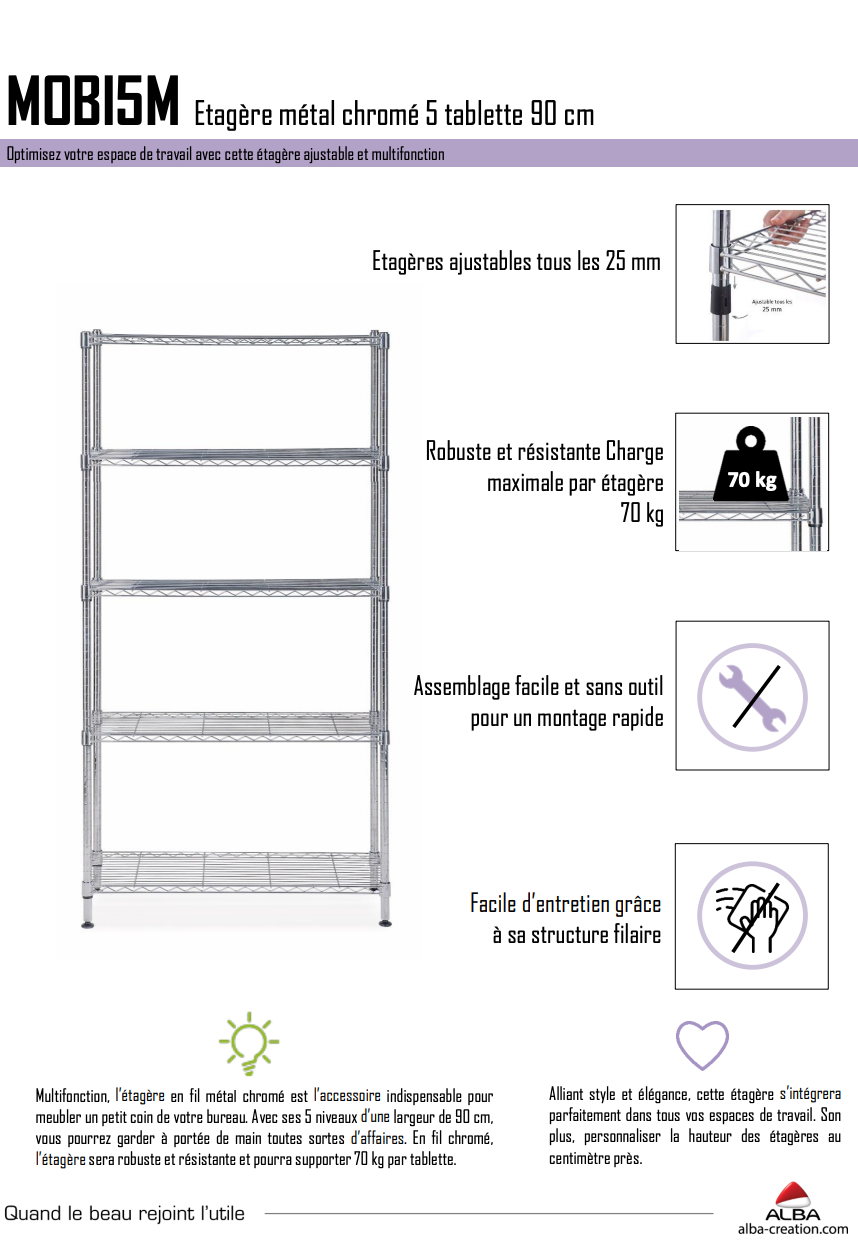 - L’étagère est composée de 5 tablettes fil de 90 cm (taille M).