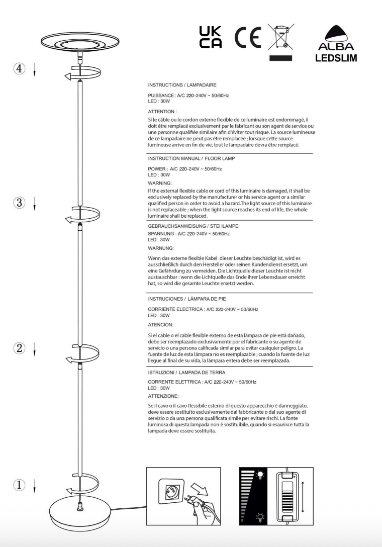 ⦁ Le lampadaire dispose d'un interrupteur sur câble avec variateur d'intensité pour alterner la luminosité selon vos envies