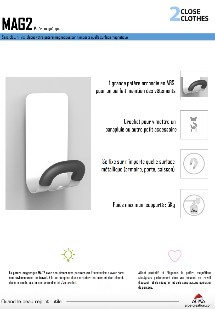 La patère murale est un objet incontournable chez Alba. Ingénieuse, la patère magnétique MAG est l’accessoire à avoir dans son environnement de travail. Sans clou, ni vis, elle s’accroche en quelques secondes sur toutes les surfaces métalliques vous permettant une grande flexibilité de mouvement. Dotée d’un crochet, la patère magnétique permet d’accrocher encore plus de petits accessoires !