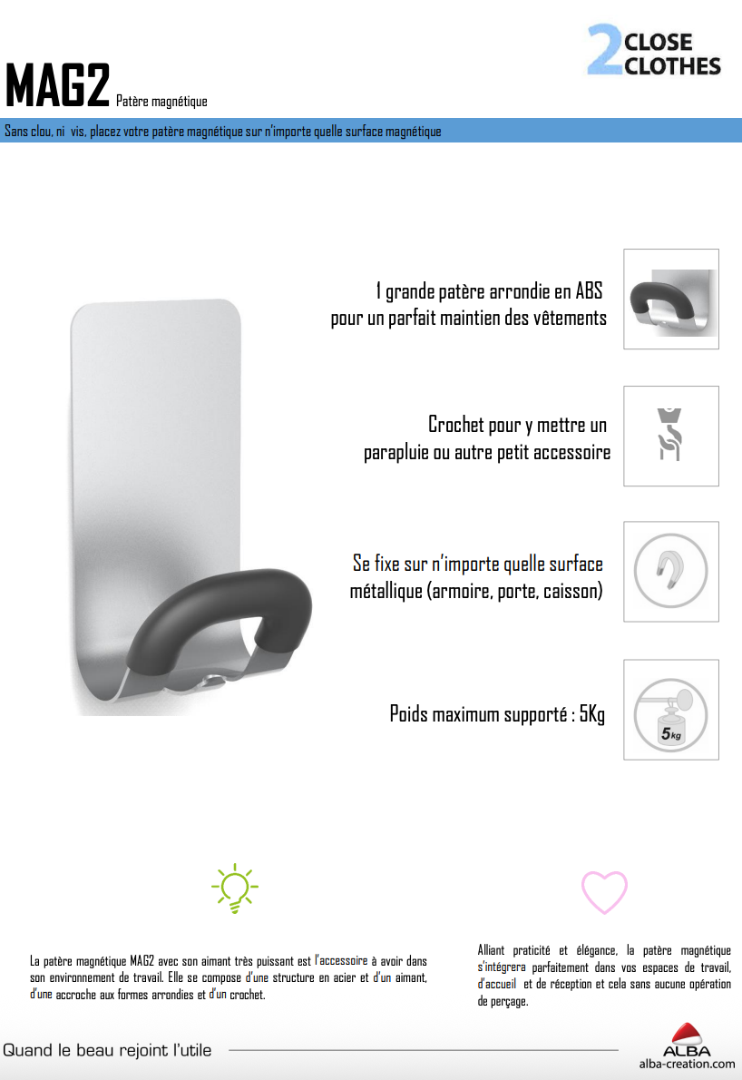 La patère murale est un objet incontournable chez Alba. Ingénieuse, la patère magnétique MAG est l’accessoire à avoir dans son environnement de travail. Sans clou, ni vis, elle s’accroche en quelques secondes sur toutes les surfaces métalliques vous permettant une grande flexibilité de mouvement. Dotée d’un crochet, la patère magnétique permet d’accrocher encore plus de petits accessoires !