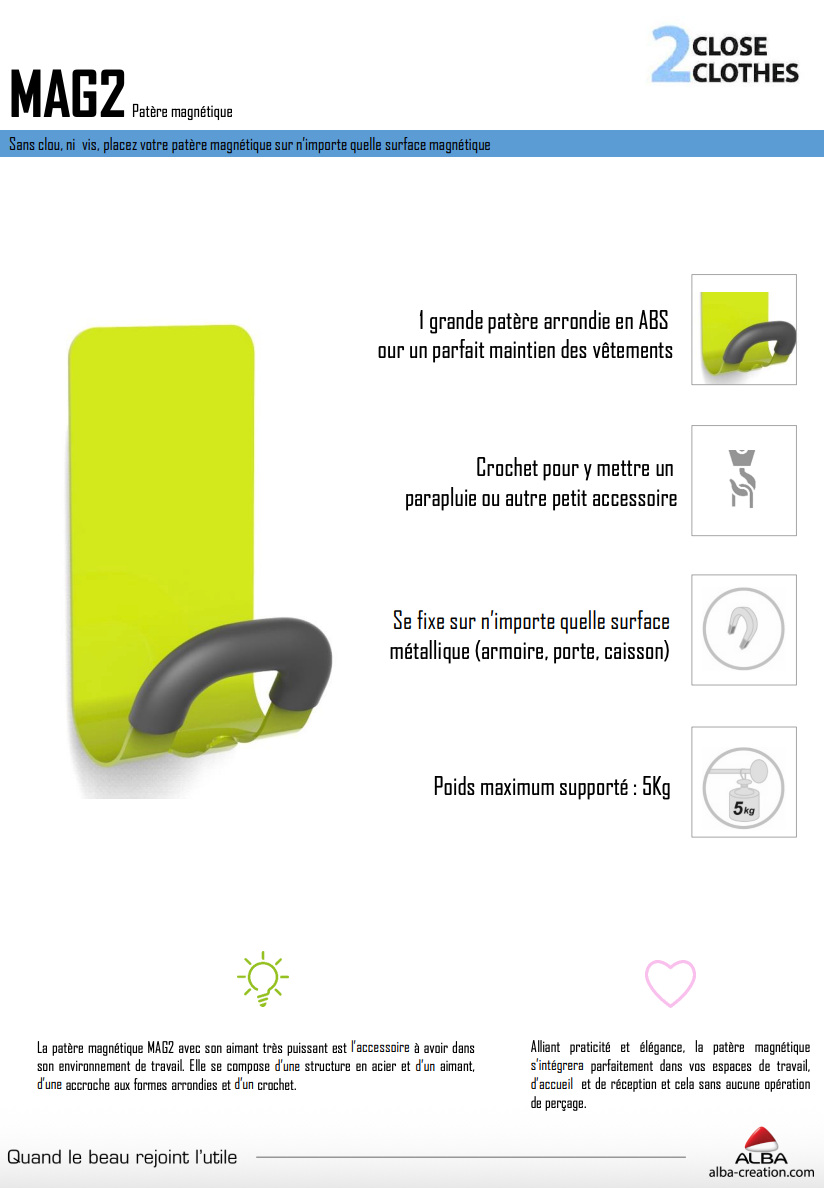 La patère murale est un objet incontournable chez Alba. Ingénieuse, la patère magnétique MAG est l’accessoire à avoir dans son environnement de travail. Sans clou, ni vis, elle s’accroche en quelques secondes sur toutes les surfaces métalliques vous permettant une grande flexibilité de mouvement. Dotée d’un crochet, la patère magnétique permet d’accrocher encore plus de petits accessoires !