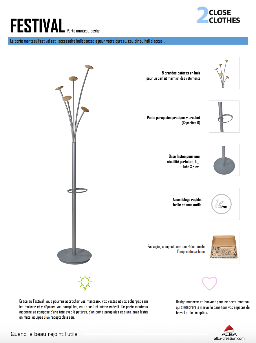⦁ Le Festival se compose de 5 grandes patères pour un parfait maintien et respect des vêtements