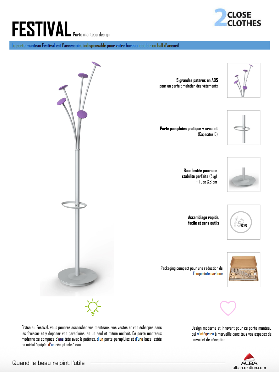 - Le Festy, porte manteaux design sur pied s’intègre parfaitement dans le décor de votre quotidien, quelle que soit votre activité et l’ambiance de vos locaux.