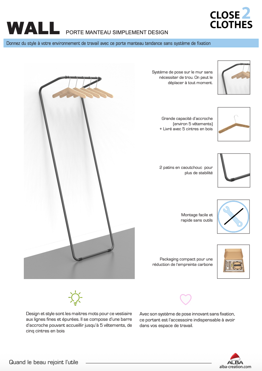 - Avec son système de pose innovant sans fixation, le vestiaire assure une stabilité parfaite. Pas besoin d’être fixé au mur : la forme du portemanteaux a été pensée pour être 100% ergonomique. Des patins antidérapants viennent notamment sécuriser le tout.