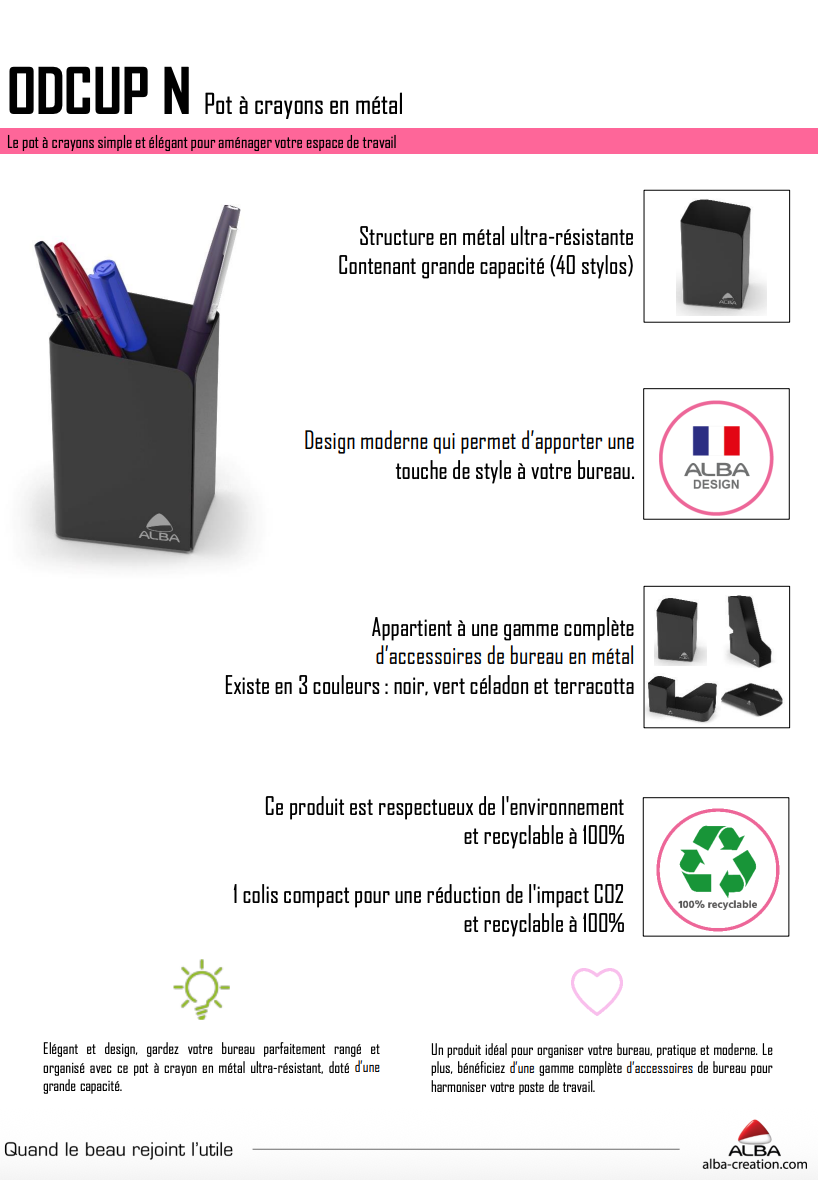 - Existe en 3 couleurs : noir, vert céladon, terracotta : des teintes élégantes pour s’adapter à toutes les ambiances de bureau.