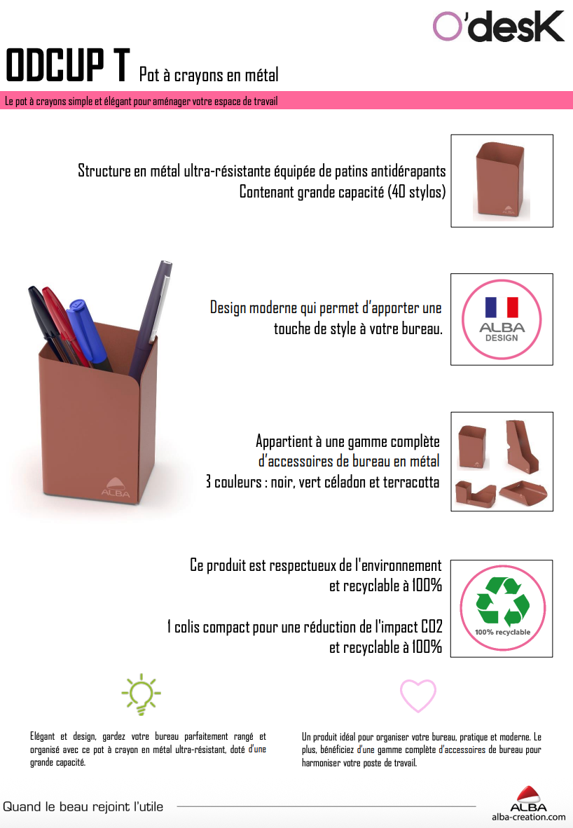 - Existe en 3 couleurs : noir, vert céladon, terracotta : des teintes élégantes pour s’adapter à toutes les ambiances de bureau.
