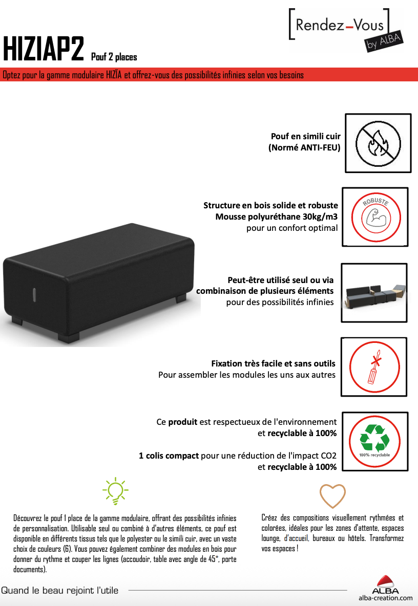 Offrez à vos espaces professionnels une touche de modernité et de flexibilité avec le pouf deux places HIZIA.