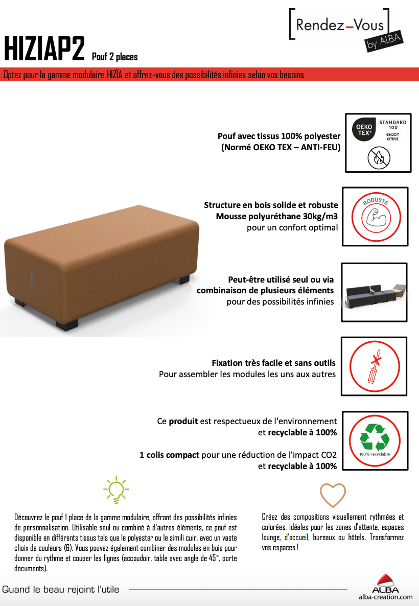 Offrez à vos espaces professionnels une touche de modernité et de flexibilité avec le pouf deux places HIZIA.