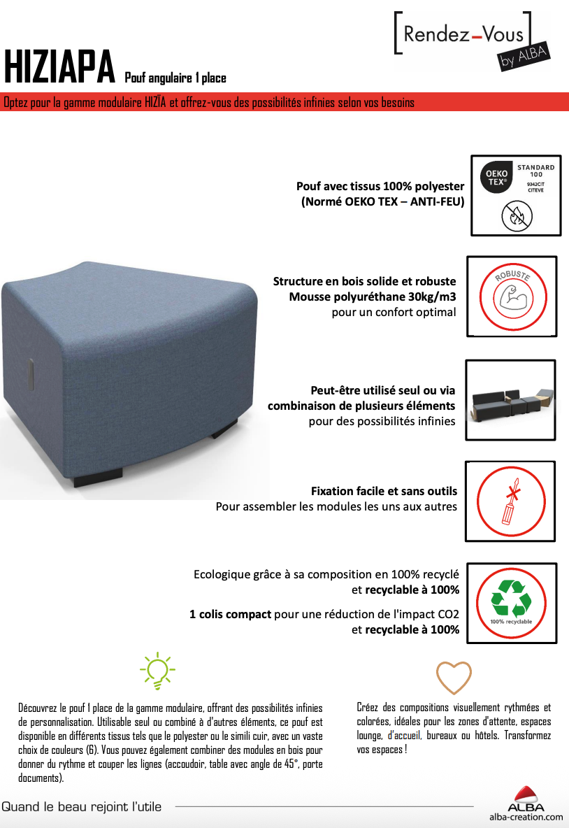 Offrez à vos espaces professionnels une touche de modernité et de flexibilité avec le pouf angulaire une place HIZIA.