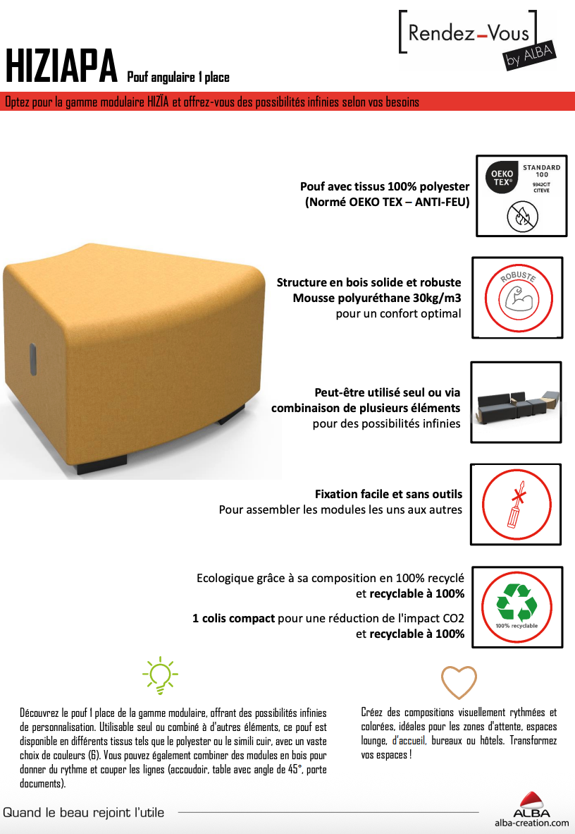 Offrez à vos espaces professionnels une touche de modernité et de flexibilité avec le pouf angulaire une place HIZIA.