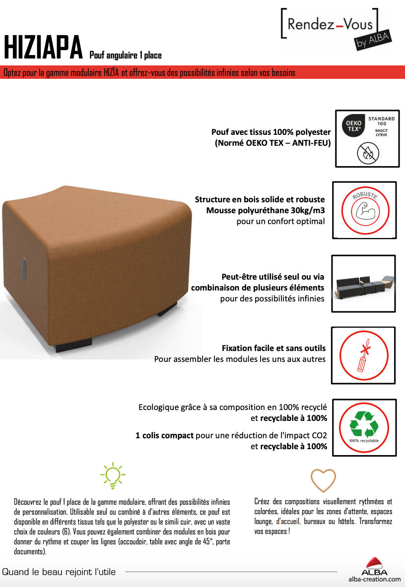 Offrez à vos espaces professionnels une touche de modernité et de flexibilité avec le pouf angulaire une place HIZIA.