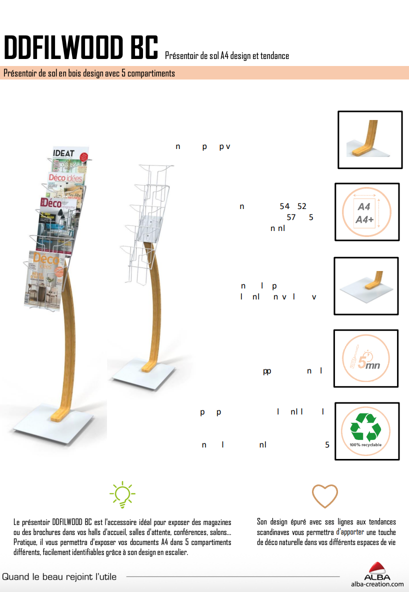 Le présentoir DDFILWOOD BC en bois est l'accessoire idéal pour exposer des magazines ou des brochures dans vos halls d'accueil, salles d'attente, conférences, salons... Pratique, il vous permettra d'exposer vos documents A4 dans 5 compartiments différents, facilement identifiables grâce à son design en escalier.
