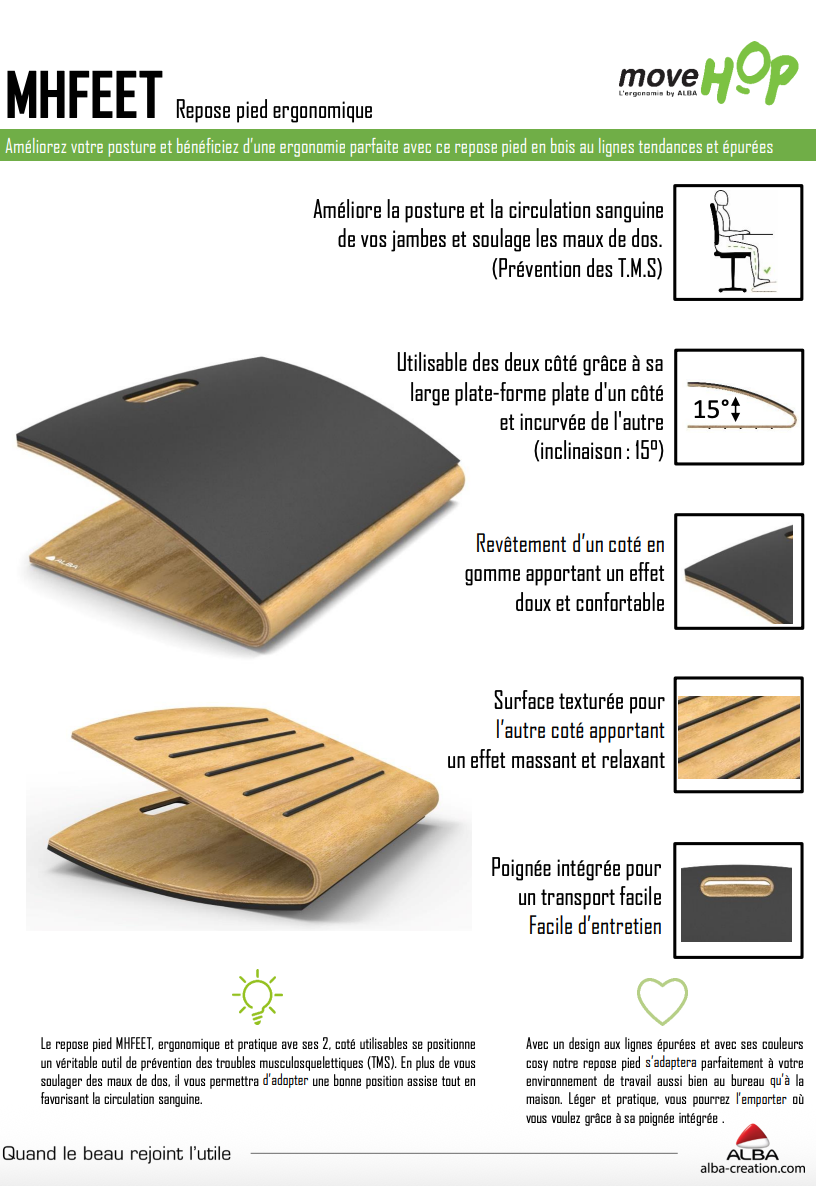 Le repose-pieds MHFEET Noir, ergonomique et pratique avec ses 2 cotés utilisables est un véritable outil de prévention des troubles musculosquelettiques (TMS). En plus de vous soulager des maux de dos, il vous permettra d’adopter une bonne position assise tout en favorisant la circulation sanguine.