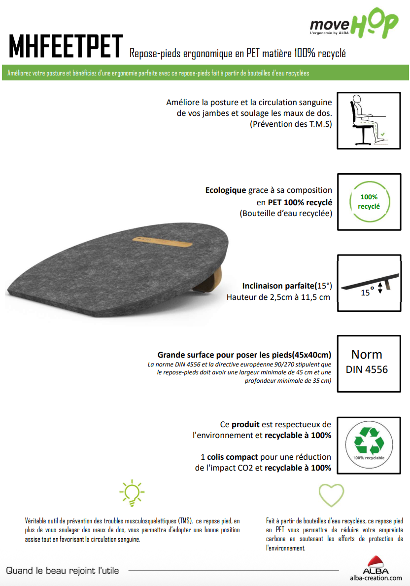 Le repose-pieds MHFEETPET ergonomique est une solution écologique et design pour améliorer votre confort au travail, que ce soit au bureau ou en télétravail. C'est un véritable outil de prévention des troubles musculosquelettiques (TMS). En plus de vous soulager des maux de dos, il vous permettra d’adopter une bonne position assise tout en favorisant la circulation sanguine.