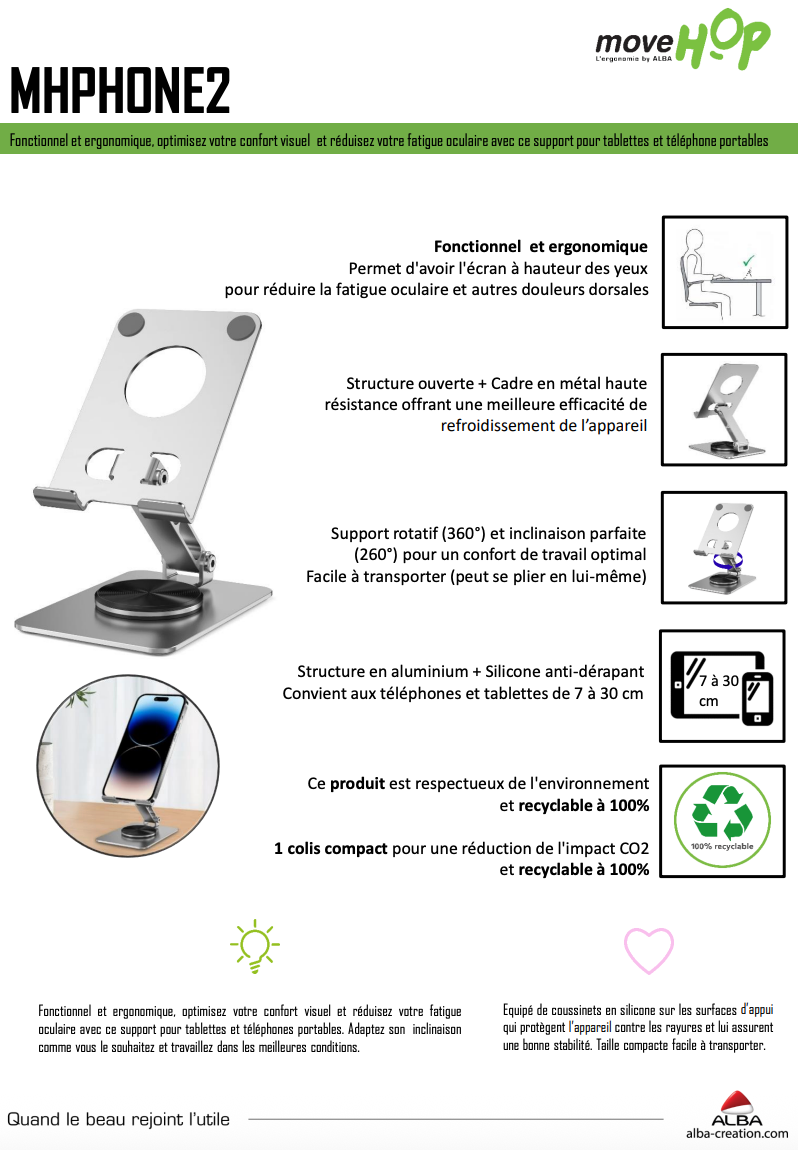 - Le support MHPHONE2 permet de placer votre téléphone ou votre mini tablette et de garder votre bureau organisé