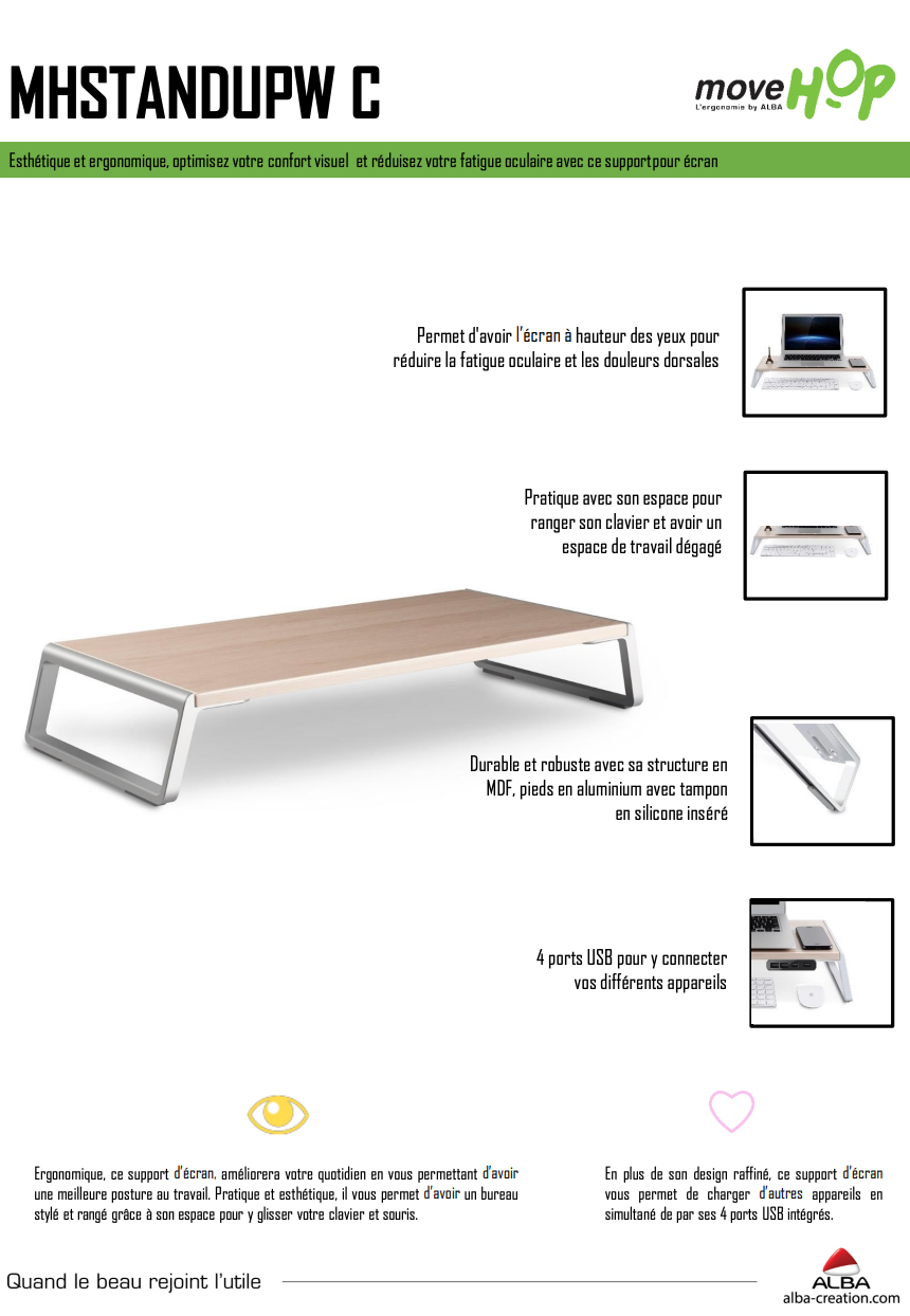 Ergonomique, ce support d’écran, améliorera votre quotidien en vous permettant d’avoir une meilleure posture au travail. Pratique et esthétique, il vous permet d’avoir un bureau stylé et rangé grâce à son espace pour y glisser votre clavier et souris.