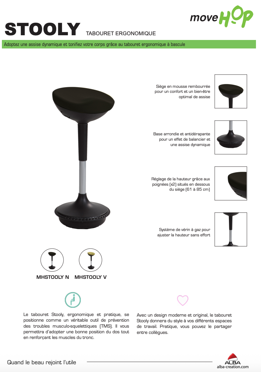Le Stooly s’accorde parfaitement avec un bureau « Assis-debout » et permet de maintenir une bonne position du dos tout en renforçant les muscles du tronc.
